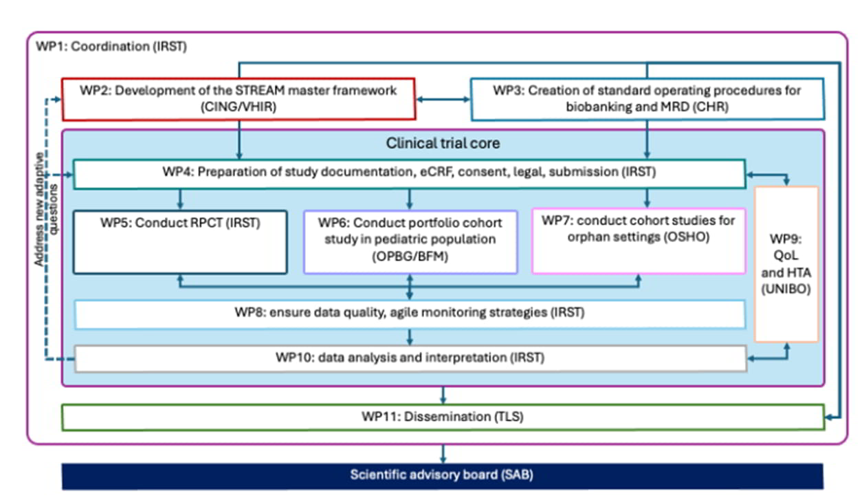 | WP2 | Development of the STREAM master framework | Design and develop the STREAM master framework, a platform that will be used for the collection of data of R/R AML and support the initiation of new pragmatic clinical trials across Europe. |